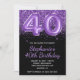Crie o seu próprio aniversário de 40 anos moderno com a arte digital do balão de folha falsa. Envie uma mensagem ao criador se precisar de um convite para uma idade diferente criada. O fundo de vidro feminino apresenta gráficos decorativos faux brilhantes roxos roxos roxos roxos roxos sobre uma cor preta sólida. O brilho luxuoso, o brilho e os efeitos de texto em folha são criados por elementos artísticos que impressão gostam de uma foto. Você pode personalizar a caligrafia caprichosa e modernos todos os estilos de fonte e cores de bonés.