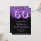 Crie o seu aniversário moderno de 60 anos com a arte digital falsa de balões de folhas. Envie uma mensagem ao criador se precisar de um convite para uma idade diferente criada. O fundo de vidro feminino apresenta gráficos decorativos faux brilhantes roxos roxos roxos roxos roxos sobre uma cor preta sólida. O brilho luxuoso, o brilho e os efeitos de texto em folha são criados por elementos artísticos que impressão gostam de uma foto. Você pode personalizar a caligrafia caprichosa e modernos todos os estilos de fonte e cores de bonés.