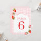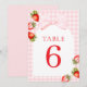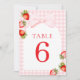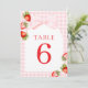 Números de Mesa Coquette Morango. Apresentando um tema de morango encantador, letra cursiva vermelha elegante e sutil acento de aquarela, este design é perfeito para uma celebração de chá de bebê na primavera ou verão.