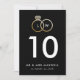 Com anéis de noivado interligados em folha de ouro falsa, este número de mesa preto de dupla face é um ótimo complemento para a decoração da sua recepção. Personalize todo o texto, incluindo o monograma do casal com duas letras, o número da mesa e seja criativo com as duas linhas de texto na parte inferior, como seus novos sobrenomes, data do casamento, local e até nomes personalizados de mesa ou uma nota sobre a história do seu amor.