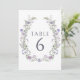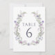Números de mesa, que são oportunamente elegantes, para casamentos com lavanda violeta, minúsculas flores silvestres e delicadas folhas verdes.