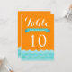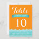 Estes belos números de mesa de casamento apresentam o oceano e as ondas em tons de azul com fundo laranja. Um design moderno e elegante que é perfeito para casamentos na praia, casamentos náuticos e casamentos de destino. Você pode personalizar os campos de texto de amostra ao seu gosto. Outros convites combinando também estão disponíveis.
