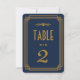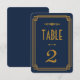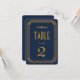 Estes números de mesa apresentam uma paleta de cores azul e dourada, uma moldura geométrica e outros detalhes estilísticos, todos inspirados no Art Déco e nos loucos anos vinte. Você pode personalizar os campos de texto de amostra ao seu gosto.