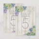 Fontes únicas, suculentas coloridas em aquarela e fundos de tábuas de madeira rústica são os destaques destes produtos de casamento para combinar. Este belo cartão de número de mesa tem bordas de folhagem nos cantos sobre um fundo de madeira clara com um modelo fornecido para editar números, nomes dos noivos e data do casamento. Procure ID515 para ver todos os produtos correspondentes neste conjunto.
