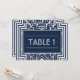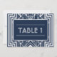 Estes números de mesa apresentam uma moldura geométrica intrincada, padrões geométricos, uma paleta de cores azul-marinho e branco, e outros detalhes estilísticos todos inspirados no Art Déco e nos loucos anos vinte. Você pode personalizar os campos de texto de amostra ao seu gosto.