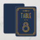Esses números de mesa apresentam uma paleta de cores azul e dourada, uma moldura geométrica e outros detalhes estilísticos, todos inspirados na Art Déco e nos loucos anos vinte. Você pode personalizar os campos de texto de amostra ao seu gosto.
