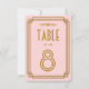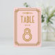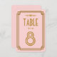 Esses números de mesa apresentam uma paleta de cores rosa e dourada, uma moldura geométrica e outros detalhes estilísticos, todos inspirados na Art Déco e nos loucos anos vinte. Você pode personalizar os campos de texto de amostra ao seu gosto.