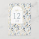 Esta elegante suíte de casamento apresenta delicadas designs florais e folhagem num esquema de cor azul e dourado para um tema de casamento coeso e atordoante. O cartão de número de tabela de coordenação mostrado aqui mostra um padrão floral doce e uma estrutura de arquivo de tendência, adicionando um toque de romance e sofisticação ao visual geral. Perfeito para casais que procuram um eterno e um belo design para o seu dia especial. Adicione suas iniciais, data do casamento e número da tabela usando o modelo fornecido. Procure ID1045 para ver outros produtos neste design de casamento.