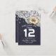 Local de Casamento/Número de Tabela/Modelos de Cartão Escort - Girassóis Elegantes, Moldes Vintage Lace e Luzes Chic String no Fundo Azul Marinho. Um Design perfeito para o seu grande dia. Todo estilo de texto, cores, tamanhos podem ser modificados para ajustado das suas necessidades!