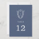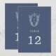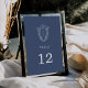 Estes números mínimos da mesa de casamento azul escuro da Coleção Daphne são perfeitos para um casamento tradicional. O simples, porém clássico, design apresenta um elegante e eterno monograma da crista real com flores e verde em torno das iniciais do casal. A placa impressão na frente e atrás (lado duplo). Adicione cada número de tabela que você precisa ao seu carrinho individualmente.