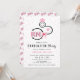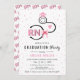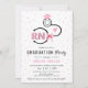Nursing shool class of 2026 stethoscope pink RN graduation Invitation. This feminime girly graduation invitation features a black stethoscope with a graduation cap, a heart, a coquette bow, confetti and the initials RN in pink. The back includes a pattern of the 'RN" initials.