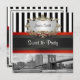 Ponte Brooklyn no Skyline NYC, Boat Invitation Suite - Doce 16 Convites de festas Personalizáveis e acessórios com uma vista de East River da ponte Brooklyn no Nova Iorque e no prédio municipal do Brooklyn com um barco passando por lá. Ele também apresenta um padrão de faixa preto-e-branco, uma fita vermelha e preta e uma etiqueta de gradiente branco com sua escolha de uma estrutura de aparência dourada ou prateada. A imagem está em preto e branco. Este produto faz parte de um conjunto de designs correspondentes que são facilmente personalizáveis para muitas ocasiões e eventos. Se você precisar de placas RSVP separadas, Notas de agradecimento, Carimbos, ímanes ou outros acessórios, por favor verifique nossas outras listas. Observe que este é um design gráfico e não contém tecidos, fitas, metais, gemas ou gravuras reais. 2012 ©NYCisMyMuse