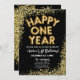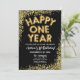 Feliz Aniversário de Um Ano pelo seu pequeno. Véspera de ano novo Perfeita Primeiro Convite de Aniversário no Design Glitter Dourado. Modelo para primeiro aniversario NYE com texto editável para usar este convite de feriado para uma primeira festa de aniversário especial! Verifique nesta coleção se há decorações de festas com brilho dourado correspondentes únicas para cada ocasião.
