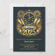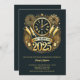 Festa de Véspera de ano novo Eletrônica do Convite NYE 2025 Personalizada. Convite digital móvel em cores pretas e Ouros com Fireworks, Champaign e Clicking Wall Clock Illustration.