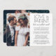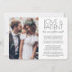 Convide familiares e amigos para uma recepção de casamento simplesmente elegante com este convite de 2 fotos moderno e sofisticado "o amor é paciente, mas não podíamos esperar". Todo o texto é simples de personalizar para qualquer celebração de recepção, incluindo uma festa pós-fuga, cerimônia de renovação de votos, casamento sequência, 1º aniversário, hora do coquetel ou jantar. Personalize-o para incluir os detalhes de sua escolha, como data do casamento, código de vestimenta, RSVP, site, etc. (DICA DE COLOCAÇÃO DE IMAGEM: Uma maneira fácil de centralizar uma foto exatamente como você deseja é cortá-la antes de fazer o upload para o site da Zazzle.) O design moderno minimalista preto e branco apresenta duas fotos do casal recém-casado, caligrafia de script manuscrita na moda e tipografia estilo máquina de escrever chic. Quer você tenha fugido devido à pandemia de covid ou tenha reduzido para uma minimononia ou micro-casamento menor e mais íntimo, a festa do felizes para sempre ainda pode começar