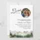 Um convite elegante para o casamento com montanhas de aquarelas e pinheiros que você pode personalizar com seus detalhes.