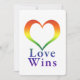 Declare que o amor ganha e mostre seu orgulho com este convite bonito do casamento. Um gráfico do coração do arco-íris flutua acima da mensagem do orgulho de vitórias do amor em um fundo branco na parte dianteira com a informação do convite no tipo preto com um fundo do arco-íris no reverso.