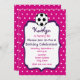 O convite de aniversário de uma menina que caracteriza um fundo cor-de-rosa com as bolinhas brancas na parte dianteira e na parte traseira. A parte dianteira caracteriza o quadro roxo brilhante com escrita roxa e cor-de-rosa. Ilustração da bola de futebol na parte superior.