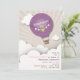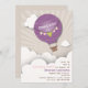 Um convite do aniversário que caracteriza uma ilustração de um balão de ar quente roxo, de nuvens, e de sunburst. Personalize o texto.