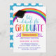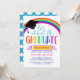Convite colorido da festa de formatura com um arco-íris boné-vestindo-se da graduação, tipografia do divertimento, e um teste padrão azul e branco da nuvem.