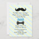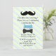 O primeiro convite de aniversário do bebê branco foi feito em uma faixa diagonal azul, verde, amarela e branca pastel, com um tema de homenzinho do bigode. Personalize o texto para o dia especial do seu filho.