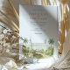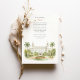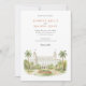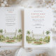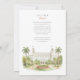 Convide seus convidados para uma ocasião realmente memorável com este belo convite de casamento em aquarela, mostrando o icônico Hotel Breakers em Palm Beach, Flórida. A trabalho de arte captura lindamente a grandeza do histórico, branco e creme resort de luxo, completo com suas torres gêmeas, orgulhosamente voando bandeiras americanas. Criada em um estilo aquoso suave e elegante, a cena é moldada por paisagens tropicais exuberantes, com palmeiras verdes, altas e graciosas. Um vibrante leito de flores circulares à frente exibe lindas flores em tons radiantes de anuários de jardim vermelhos e suaves, possivelmente rosas ou clássicos, complementados por folhagem verde rica e gramados meticulosamente. Este convite exumenta sofisticação e é perfeito para um luxuoso casamento de destino ou uma celebração clássica da Flórida. A frente apresenta elegantemente seus detalhes de casamento, enquanto o lado inverso oferece "Os detalhes mais finos" para informações adicionais sobre convidados. A paleta colorida inclui brancos nítidos, cremes quentes, vários verduras verdes vermelhos das palmeiras e gramados, vermelhos vibrantes e pinks das flores e tons sutis arenosos dos caminhos.