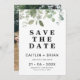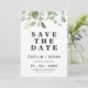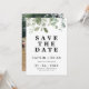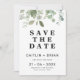 O casamento entre eucaliptos ou foliagens salve o cartão com um arranjo no topo do cartão. Ideal para um casal tendo um casamento no estilo country, fazenda rural ou boêmia ou procurando um estilo simples e minimalista para salvar o cartão.