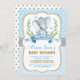 Convite lindo do chá de fraldas do azul e do ouro que caracteriza a ilustração da aguarela de um elefante adorável do bebê