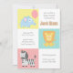 Design colorido dos desenhos animados dos animais bonitos do jardim zoológico que consistem no elefante azul, no leão alaranjado e na zebra. A página reversa consiste no mesmo design arranjado em um estilo do teste padrão. O design é ponto morto do género, fazendo a apropriada para o bebé e a menina. Faça seu chá de fraldas extremamente especial com este convite adorável do chá de fraldas que está indo imprimir seus convidados. É igualmente apropriado para festas de aniversário do tema dos miúdos como o safari e o tema da selva. Convide pode facilmente ser personalizado com seus detalhes do partido. Favoritos para festas de harmonização disponíveis. Projetado pelo Doodle oxidado.