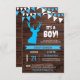 Rústicos impressionante, convites do chá de fraldas do tema do fanfarrão do país para meninos. O cervo azul do fanfarrão da silhueta na madeira rústica almofada o fundo e bandeiras de suspensão do bojo. /turquoise azul e cores brancas na madeira escura marrom. É UM MENINO! Modelos do convite. Texto editável. Etiquetas de harmonização Get!