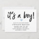 Um chá de fraldas moderno para um chá infantil. O texto diz "é um menino!" numa letra moderna. Há um coração azul no meio e a informação do chá de fraldas segue. A parte de trás do cartão é uma simples cor azul que corresponde ao coração. Um chá de fraldas perfeito para os minimalistas!