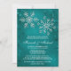 Os convites bonitos do chá de casamento dos casais do floco de neve com os dois flocos de neve bonito com uma folha e um design floral e um coração deram forma a reflexões do gelo e da neve atrás dele. Os olhares hued deste fundo da cor do verde lindo de turquesa do azul de pavão da cerceta como ele incandescem. Aperfeiçoe para um Natal do país das maravilhas do inverno ou um chá temático dos casais do feriado para que os noivos sejam. © Chrissy H. Estúdio dos trabalhos de arte, LLC. Todos os direitos reservados.