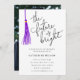 Cartão de modelo de convite para festa de formatura moderna com um roteiro de tipografia manuscrito que diz "o futuro é brilhante." Há uma ilustração de uma tassel roxa ao lado dela. Você pode adicionar a foto do formando na parte traseira da placa. Excelente para segundo grau e formando universitário.