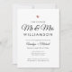 Este convite mínimo de festas de noivado brilha através da sua simplicidade. Belo roteiro com elogios lê "O Futuro Sr. e Sra." ao lado de seus detalhes pessoais de celebração na tipografia moderna. Acima, está um delicado coração de rosa de ouro falso.
