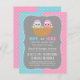 Convide seus convidados a compartilhar em sua notícia especial! Menino ou menina? Este convite elegante e elegante tem duas corujas do bebê com os nightcaps pequenos bonitos, uma coruja está no azul e no outro no rosa. Estão espreitando fora do ninho. Fundo cinzento neutro do género de modo a para não dar afastado o género. Fundo de bolinhas azuis em um lado e das bolinhas cor-de-rosa no outro. Personalize facilmente com seus detalhes do partido.