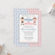 Um género temático ocidental revela o convite de festas. Ilustrações bonitos de um vaqueiro e de uma vaqueira pequenos com um teste padrão em ferradura cor-de-rosa e azul. Doodles de Scrappin do © dos gráficos em www.scrappindoodles.com