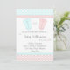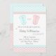 Um fresco, um divertimento e um género moderno revelam o convite de festas para o mais atrasado, torção de u até agora em chás de fraldas. Este convite bonito tem ziguezagues azuis pálidos, pastel da viga à parte superior e falso cor-de-rosa e a fita branca das bolinhas. À parte inferior são as vigas do rosa pastel e uma fita azul pálido do falso das bolinhas. Ao centro, junto com seu fraseio, são os ternos de uma peça só cor-de-rosa e azuis do romper do babygrow com o texto: menino ou menina?
