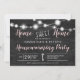 Luzes russas fazem uma festa de aquecimento doméstico com luzes brancas de cordas, tipografia moderna e elegante, e uma chave branca num quadro negro e rústico. Celebre sua nova casa de estilo.