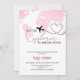 Este design apresenta um chá de fraldas de tema de aventura "A Little Explorer is Landing Soon" com um mapa do mundo de aquarelas cor-de-rosa e um pequeno plano giro na rota. Tema minimalista e moderno de chá de fraldas de menina.