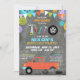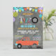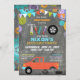 O tema do mecânico com caminhão de recolhimento e pneus e bandeira colorida da estamenha, as ferramentas, e o impressão das engrenagens e do fundo das engrenagens para trás projetam o cartão do convite do aniversário.