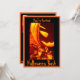 Esta é uma foto de um jack-o-lanterna iluminada. O jack-o-lanterno está sentado numa cama de folhas de ouro. Um brilho estranho está sendo visto. Um símbolo do Dia das Bruxas. Este é um convite para uma festa de fantasia. Pode ser personalizado no verso com seu próprio texto. Um carimbo e um envelope também estão disponíveis neste estilo.