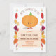 Um convite de Ação de Graças com folhas de cor do outono com uma abóbora sorridente que está pronta para o feriado. Os convites têm um esquema de cores de outono, branco e creme. Todo o texto é personalizável.