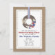 Um convite de festas de inauguração com ilustração de uma coroa monográfica com um esquema vermelho de cor branca e azul. A coroa apresenta rosetas e está pendurada na fita chevron. O fundo é inspirado em burlap. Personalize a coroa com a letra do seu início. Personalize o texto com detalhes da sua ocasião.