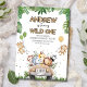 Tema Safari Selva Primeiro Aniversário Prepare-se para enlouquecer! Celebre o grande marco do seu explorador com este adorável convite de aniversário do Wild One safari. Apresentando charmosos animais da selva aquática cavalgando em um jipe safari com um verde e balões divertidos, este convite é perfeito para o primeiro aniversário do seu bebê. Personalize facilmente o nome do seu filho, os detalhes da festa e as informações de RSVP. Ideal para uma selva ou celebração de primeiro aniversário com tema safari!