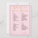 Apresentando o encantador jogo "What's in Your Purse", um encantador acréscimo ao seu chá de panela que promete risos, conexões e um toque de elegância. Contra um pano de fundo de rosa macio, este jogo dá palco a uma jornada que alegra o coração enquanto os hóspedes exploram o conteúdo de suas bolsas, revelando tesouros ocultos e criando memórias carinhosas. As palavras "What's in Your Purse" são lindamente reproduzidas em uma letra dourada que expele sofisticação e charme. Enquanto os convidados vasculham suas bolsas, eles vão descobrir uma multidão de itens cada um com um valor de ponto único, que varia de 5 a 20 pontos. Esta reviravolta divertida em uma caça tradicional ao tesouro evoca certamente risos e camaradagem enquanto os participantes marcam suas pontuações. Os itens do jogo são apresentados em uma fonte de bloco preto limpo, garantindo clareza e acessibilidade para todos. Adornada com uma elegante fonte cursiva de ouro, os rótulos "nome" e "total", acompanhados pelas linhas de ximersão, adicionam um toque refinado ao design geral. Esse detalhe captura a essência da ocasião, misturando o glamour com a brincadeira. Com uma fronteira eterno negra, "O que há na sua bolsa" apresenta uma estética clássica que complementa qualquer tema de chá de panela. Para além da diversão do jogo, esta experiência promove ligações à medida que os convidados partilham histórias sobre os itens únicos que desenterraram. Elevem seu chá de panela com o jogo "O que há na sua bolsa", onde surpresas alegres encontram o charme da conexão. Este jogo é mais do que apenas entretenimento; é uma oportunidade de fazer memórias, celebrar amizades e celebrar a beleza dos pequenos tesouros da vida.