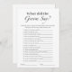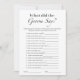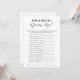 Apresentando "O que o noivo disse?" - um cartão de chá de panela preto e branco chic e minimalista projetado pela CaMiDesigns. Este jogo divertido e engajado é perfeito para adicionar um toque de entusiasmo ao seu chá de panela, permitindo que os hóspedes testem seu conhecimento dos pensamentos e experiências do noivo. Com seu elegante design, complementa sem interrupções qualquer tema de chá de panela. Para obter assistência com pedidos, envio, informações sobre produtos e muito mais, entre em contato diretamente com o Atendimento ao cliente da Zazzle.