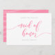 Na moda, você será minha placa de Madrinha de casamento com as palavras "madrinha de casamento" em um script cursivo relaxado, rosa, contra fundo branco. A placa tem um lado traseiro cor-de-rosa com linhas brancas sobrepostas. Personalize-o substituindo o texto do marcador de posição. Para obter mais opções, como alterar a fonte e seu tamanho/cor ou o espaçamento entre letras, clique no botão "Personalizar". *Observe que a Marca d'água do Zazzle que aparece na visualização de zoom NÃO aparecerá no produto impresso final. © Rosewood e Citrus