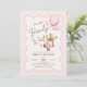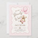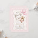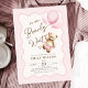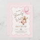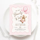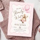 Podemos esperar o convite de chá de uma menina. Urso de pelúcia com design em cores cor rosa, castanho, bege e creme neutro. Apresenta um quadro de bolhas ondulado moderno, ursinho de peluche agudo, balões e fontes de script. Perfeito para uma elegante celebração de chá de fraldas. Personalize com seus próprios detalhes. Impressos convites Zazzle ou modelo de impressão digital instantânea para download.