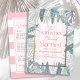 Este convite de final de semana da despedida de solteira "Summer I Turned" apresenta folhas tropicais exuberantes com uma estrutura falsa/falsa de ouro em um fundo de listras de rosa claro. O verso apresenta um itinerário. Personalize-o para as suas necessidades. Você pode encontrar produtos correspondentes na minha loja.