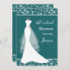 O vestido branco de casamento em um fundo teal, com Chá de panela de cor damasco. Este convite também está disponível em outras cores.